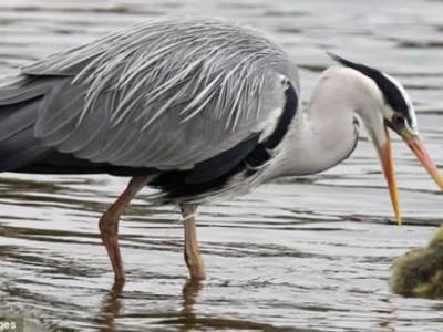 这只毛茸茸的小鹅在伦敦海德公园九曲湖游泳时,苍鹭迅速来到它身后。 这位捕食...