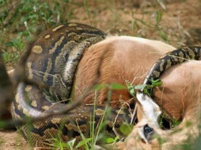 巨蟒准备吞食猎物 当动物身上的蟒蛇缠绕的更紧时,它的生命力不断流失,眼睛也变...