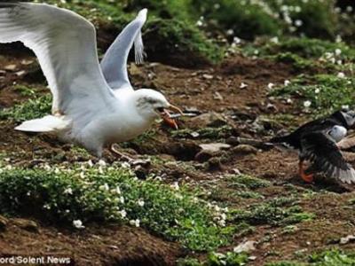 海鸥抢夺海雀口中食物 这只海雀从海中捕到一条鳗鱼,上岸走向巢穴时遭到这只体...