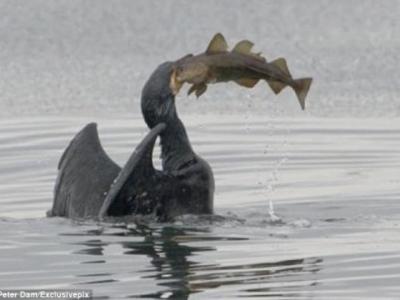 鸬鹚捉到的鳕鱼比自己喉咙还粗 鸬鹚晃动头部将鳕鱼硬吞进肚 同伴羡慕围观“...