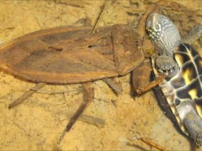 日本巨型有毒水蝎捕食小草龟 根据它们的食肉习性,这些虫子又被称作“巨鱼杀手...