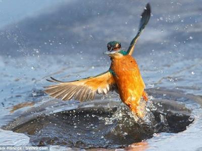 翠鸟严寒冬季潜入冰洞中捕食鲦鱼