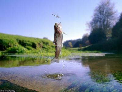 小鲑鱼跳出水面捕食昆虫瞬间 小鲑鱼跳出水面捕食昆虫瞬间 小鲑鱼跳出水面捕...