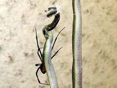 这条蛇离开地面,悬在蜘蛛网上。这只蜘蛛移向蛇,以便将其杀死。 这只14厘米长...