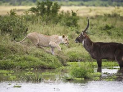 发现池塘中的水羚后,母狮决定慢慢靠近而后突然发起攻击,如果得手,便可享受一顿...