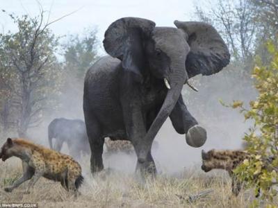 一群土狼试图猎杀一头小象却遭母象猛烈反击