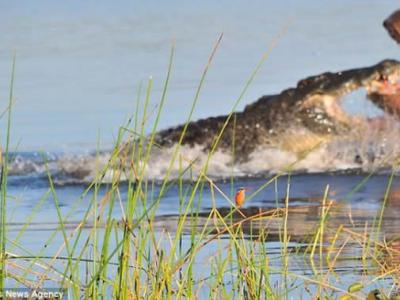 摄影师正在非洲一条河旁给这只颜色鲜艳的翠鸟拍照,一条鳄鱼和一头河马突然从他正...