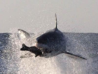 南非大白鲨跃出水面捕猎