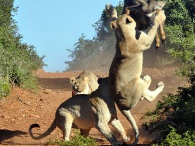 一头狮子腾空跃起,试图把羚羊击倒在地,但是与它的猎物相比,这头狮子跳的还是低...
