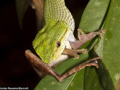 婆罗洲响尾蛇吞食树蛙