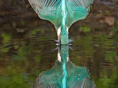 在埃尔德河,翠鸟入水时在水面上形成了一个完美的倒影。 摄影师萨沃尔在河中放...