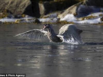 北极熊突然从北极鸥身后浮出水面,张口咬住没有任何防备的北极鸥的背部。 北极...