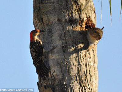 红腹啄木鸟发出叫声示意松鼠马上离开它的巢穴 固执的松鼠拒绝让步激怒啄木鸟,...