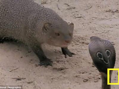 印度灰猫鼬和眼镜蛇紧盯对方 谁是谁的晚餐?猫鼬发现眼镜蛇后,开始围着他打转...