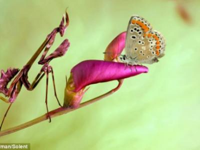 一只Empusa螳螂与花色融为一体,正准备袭击一只落在花朵上毫无防备的蝴蝶 西...