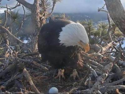 母“Jackie”紧张照看白头海雕蛋。白头海雕父母喜迎今年首枚白头海雕蛋。(神秘的地...