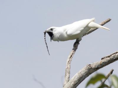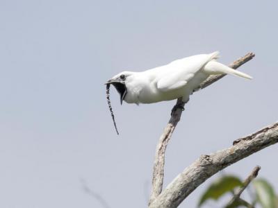 一只雄白钟雀正在发出求偶的鸣声。 之后它们会透过伸展从喙上长出的长条黑肉垂,进...