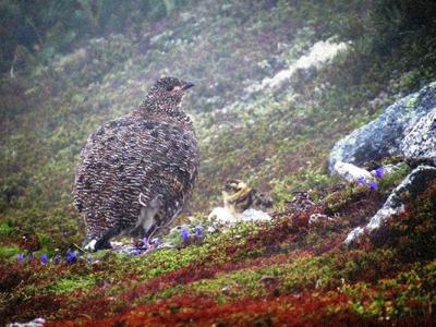 破蛋而出的雷鸟雏鸟(右)依靠雌鸟(左)身旁。估计是已孵化的雷鸟蛋壳。(神秘的地...
