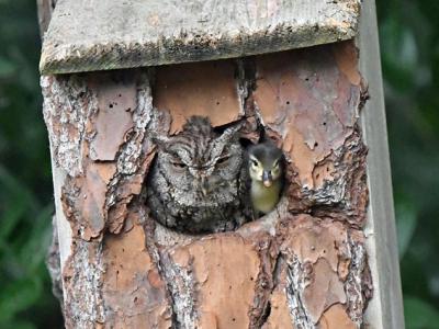 美国佛罗里达州这只猫头鹰将小木鸭共享巢