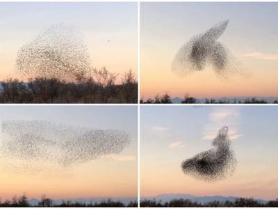 西班牙一群八哥鸟为避猎鹰不停改变队形