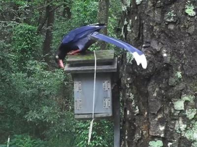 台湾蓝鹊觊觎巢箱内青背山雀的幼鸟,最后因巢箱孔洞...