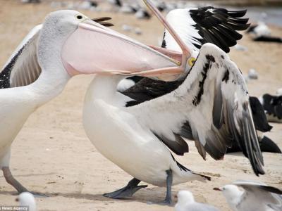 澳大利亚南部艾尔半岛上两只鹈鹕上演夺食大战 (神秘的地球报道)据环球...