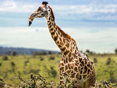 坦桑尼亚恩戈罗戈罗自然保护区红嘴牛椋鸟在长颈鹿牙缝里寻找食物 (神秘...