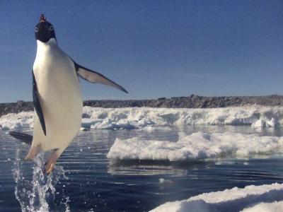 南极拍摄企鹅觅食归来兴奋跃出水面
