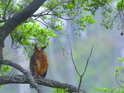 黄鱼鸮白天通常都在森林里睡觉,但即使知道它就在这片林子里,在林子外用望远镜看...