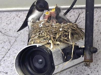 日本福冈县小燕子在监控摄像头上筑巢