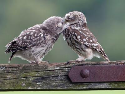 英国一只猫头鹰妈妈给孩子喂食似接吻