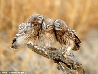 三只猫头鹰幼崽为它们的首次高空飞行互相拥抱壮胆 三只猫头鹰幼崽为它们的首次...