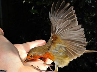 摄影师马特拍摄知更鸟在人类手中取食精彩画面 给这只知更鸟喂食的正是马特的父...