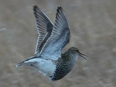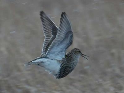 这是在阿拉斯加的巴罗显示飞行的雄性鹬鸟和其膨胀的咽喉(Calidris melanotos)。...