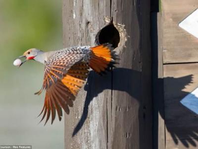 摄影师发现,这只北扑翅鴷从位于美国黄石国家公园的巢穴飞走。一只体型更大的欧椋...
