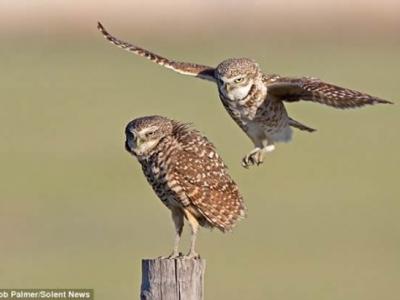这只雄穴鸮从背后袭击了没有戒备的雌鸮,试图霸占它的栖息处。 这只雄穴鸮先是...