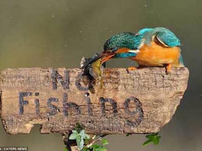 翠鸟公然在“禁止捕鱼”的警示牌上吃鱼