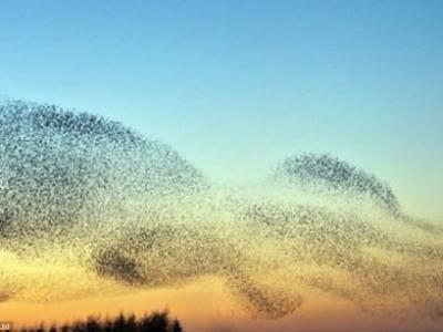 大堆鸟儿空中“编队”飞行,整体外观如章鱼 之后,群鸟的“编队”又变成形似鲸...