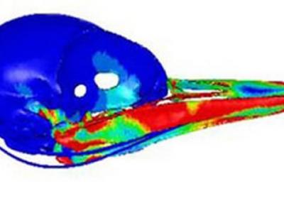 计算机模拟演示精确的表现了作用力是如何分布在啄木鸟的头骨上的 研究人员通过...