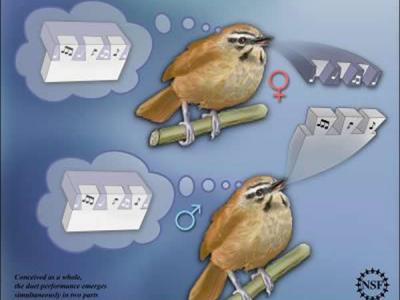 淡尾苇鹪鹩同时合唱出二重唱,其合唱完整度有如一整体。 结婚良久的夫妇可以完成...