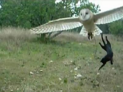 小猫跳起来,试图摸到低空盘旋的猫头鹰 猫头鹰和小猫轻轻啄对方的脸颊 近日,...