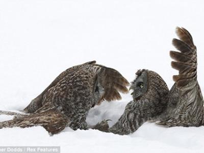 雄性猫头鹰正对它的“公主”进行爱情攻势。它们相互打闹嬉戏着,甜蜜的爱意已经让...