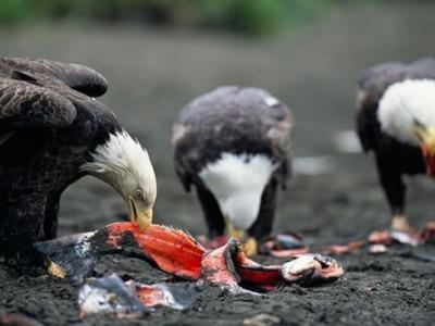阿拉斯加海岸上,美国白头海雕在啄食鱼 据《美国国家地理》报道,美国国鸟白头海...