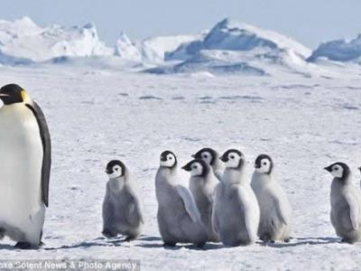 成年企鹅带领一群小企鹅雪中散步 小企鹅沐浴在母爱的阳光下 新生小企鹅沐浴...