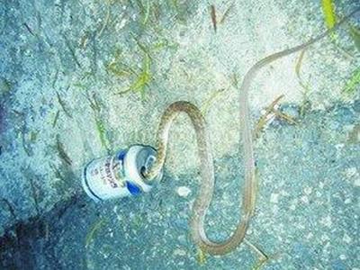 草花蛇钻进啤酒罐被困死