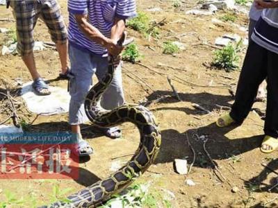 广西村民放羊被大蟒蛇追逐 蟒蛇将30斤重