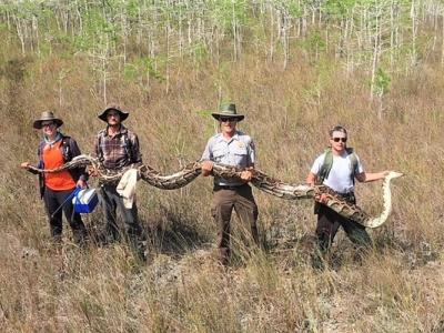 美国佛罗里达州大沼泽地国家保护区捕获5.18米长雌性缅甸蟒 身...