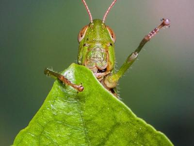 一只蚱蜢爬上一片木槿花叶子顶端兴奋地“挥手” 一只蚱蜢爬上一片木槿花叶子顶...