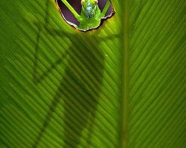 一只饥饿的蚱蜢好像在玩捉迷藏,从一片大绿叶的洞中惊奇地窥视着 一只饥饿的蚱蜢...