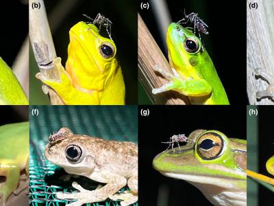 雌蚊在三种澳大利亚树蛙的鼻孔中取食,包括Litoria fallax(a-e)、Litoria peronii ...
